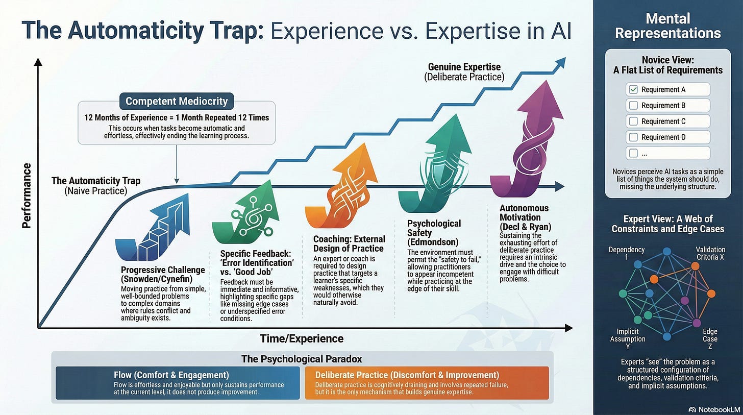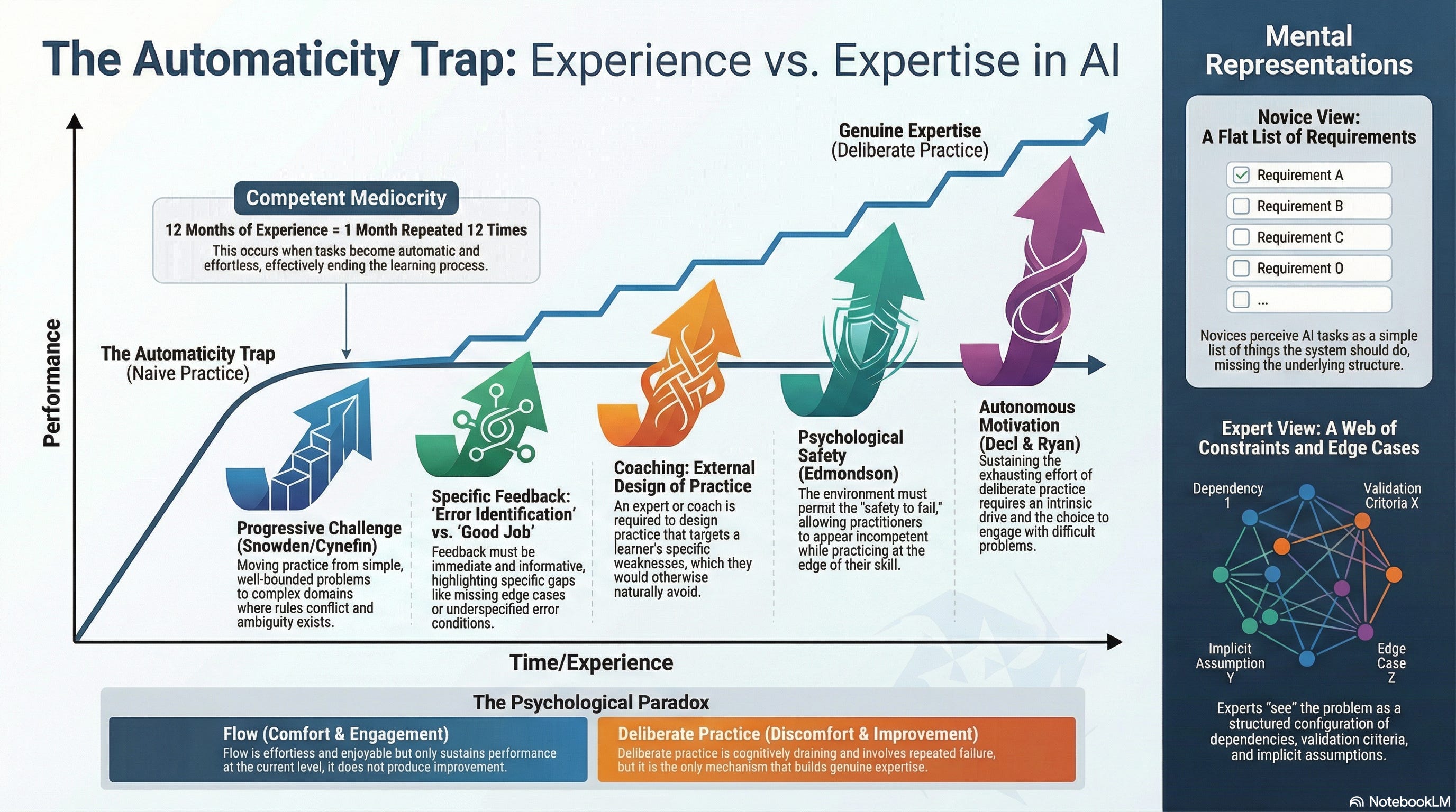 Argyris identified the organisational expression of this individual phenomenon. His “skilled incompetence” — the highly developed ability of smart people to avoid learning, is the professional equivalent of Ericsson’s automaticity. Argyris’s Model I behaviours (unilateral control, suppress negative feelings, win, do not lose) become automatic through years of professional socialisation, and their very automaticity makes them invisible to the person displaying them. The senior architect who “just knows” the right technical approach is not exercising expert judgment. They are exercising automatic pattern-matching that was calibrated for a world that perhaps no longer exists. Ericsson explains why they cannot improve through additional experience: the same automaticity that makes their current performance effortless prevents the conscious, effortful engagement that improvement requires.