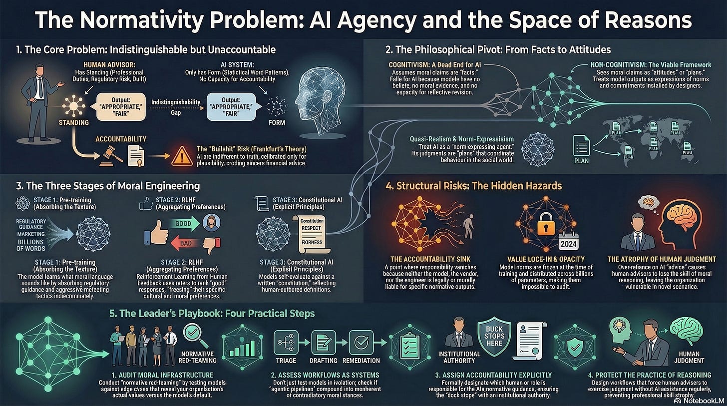 The practical step is to treat AI-generated normative guidance with the same accountability framework you would apply to human advisory guidance. If a human advisor said it, who would be responsible? That person (or their organisational equivalent) is responsible when the model says it. This is not a technical solution. It is an institutional one: a decision about where the buck stops, documented, communicated, and enforced.
