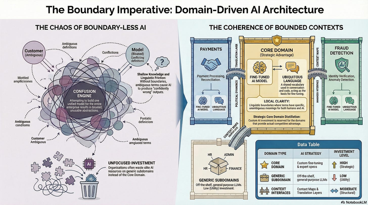 Evans’ decomposition principle applies: instead of one large, general-purpose AI generating applications across the enterprise, you should have several domain-specific AI configurations, each aligned to a bounded context, each grounded in that context’s ubiquitous language, each producing output that is coherent within its domain’s model. This is separation of concerns applied to AI architecture.