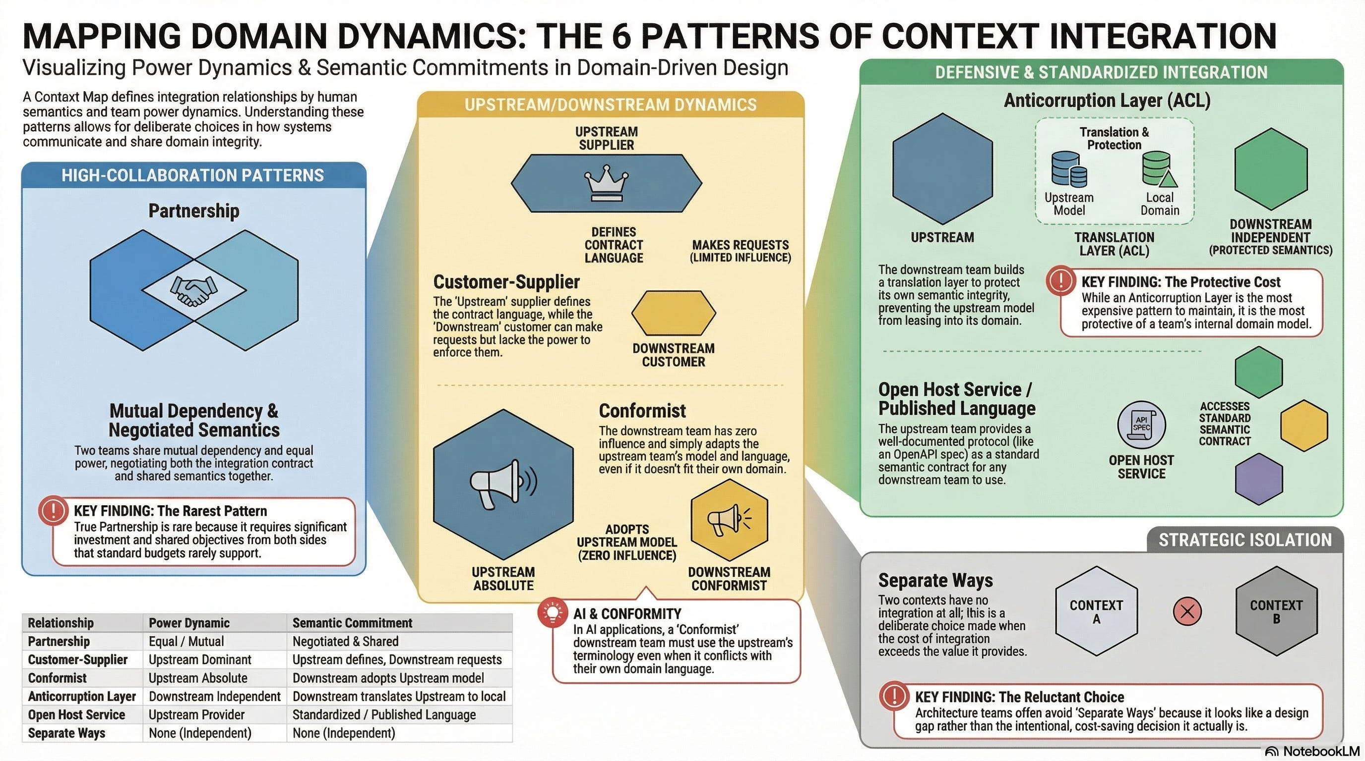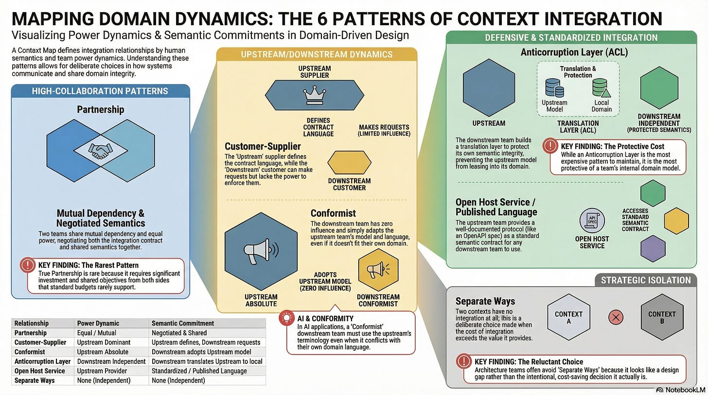 The context map reveals things that architecture diagrams do not. It reveals which teams are in conformist relationships they never chose, silently absorbing the semantic assumptions of upstream systems they cannot influence. It reveals which integrations are missing anticorruption layers, allowing one domain’s language to pollute another’s. It reveals where the published language is actually just an undocumented API that happens to work today and will break without warning tomorrow.