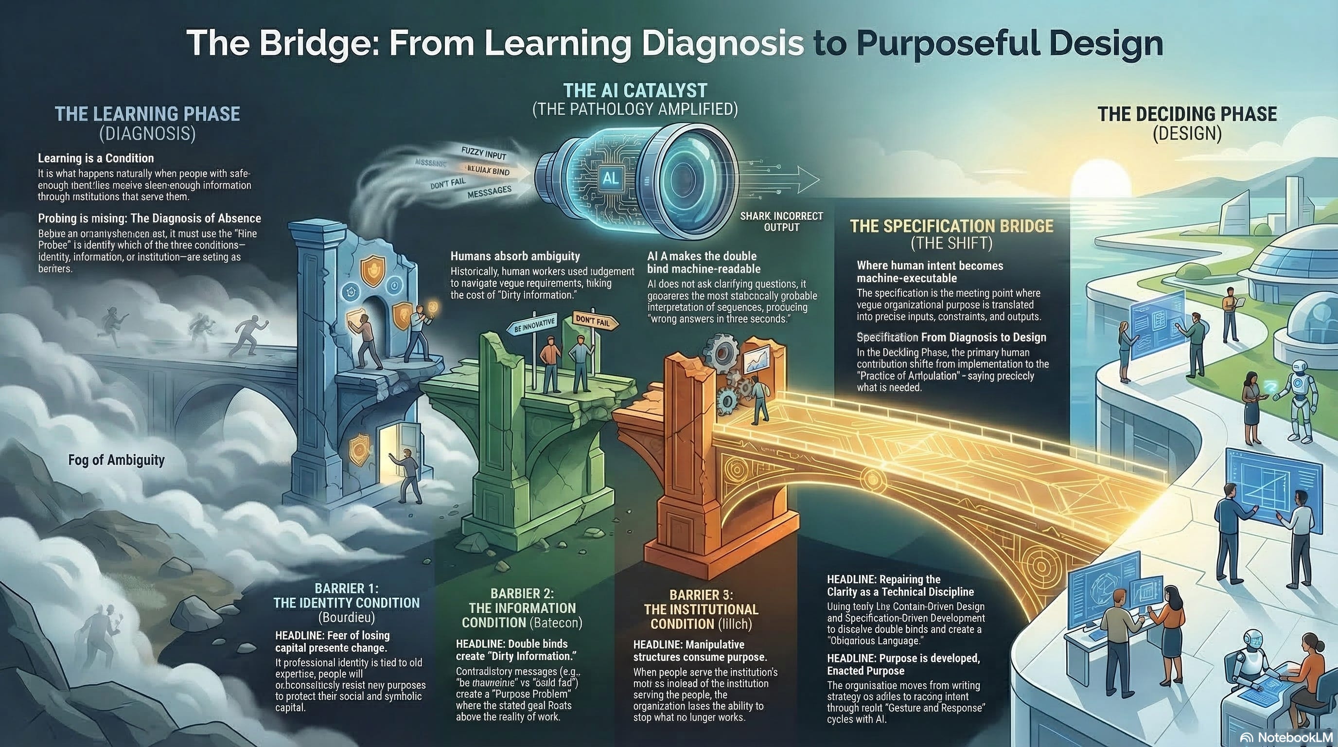 This is why Learning must come first. Without these conditions, the Deciding phase operates on corrupted input. The language will be diplomatic rather than precise. The models will be unchallengeable because challenging them is unsafe. The commitments will be premature consensus rather than designed artefacts. The decisions will be, in the language of the companion essay, organisational hallucinations: confident, fluent, plausible, and wrong.