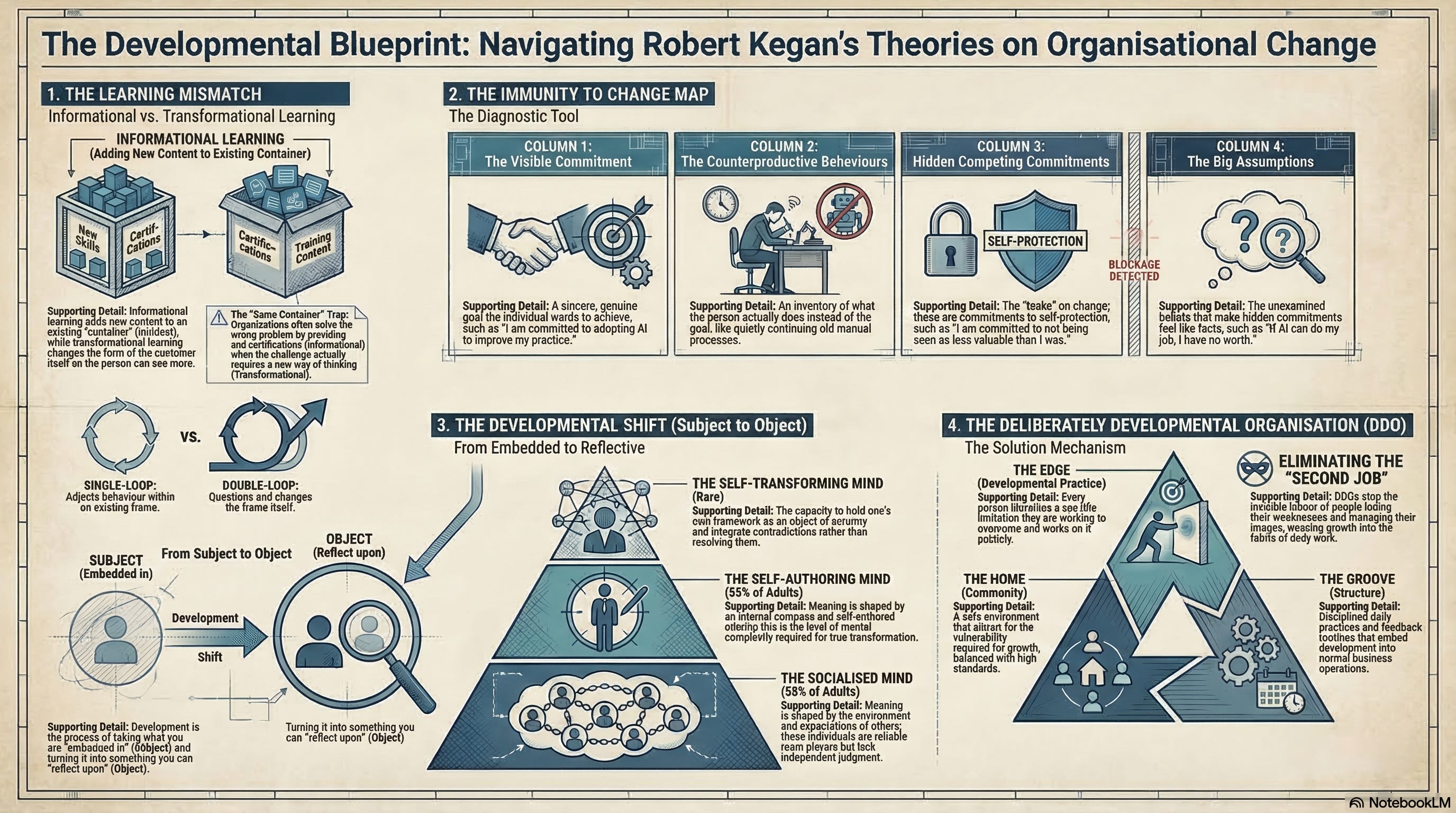 Robert Kegan, a developmental psychologist who spent forty years at the Harvard Graduate School of Education, diagnosed why this happens. His answer is structural, uncomfortable, and directly relevant to anyone watching a transformation stall: people do not resist change. They are immune to it. And the immunity operates through a mechanism invisible to the person it controls. Kegan provides what Argyris could not: the developmental explanation for why intelligent people who agree that their governing assumptions must change consistently fail to change them. The governing assumptions are not merely undiscussed. For many people, they are undiscussable, because they operate at a level of the self that the person’s current developmental capacity cannot reflect upon.