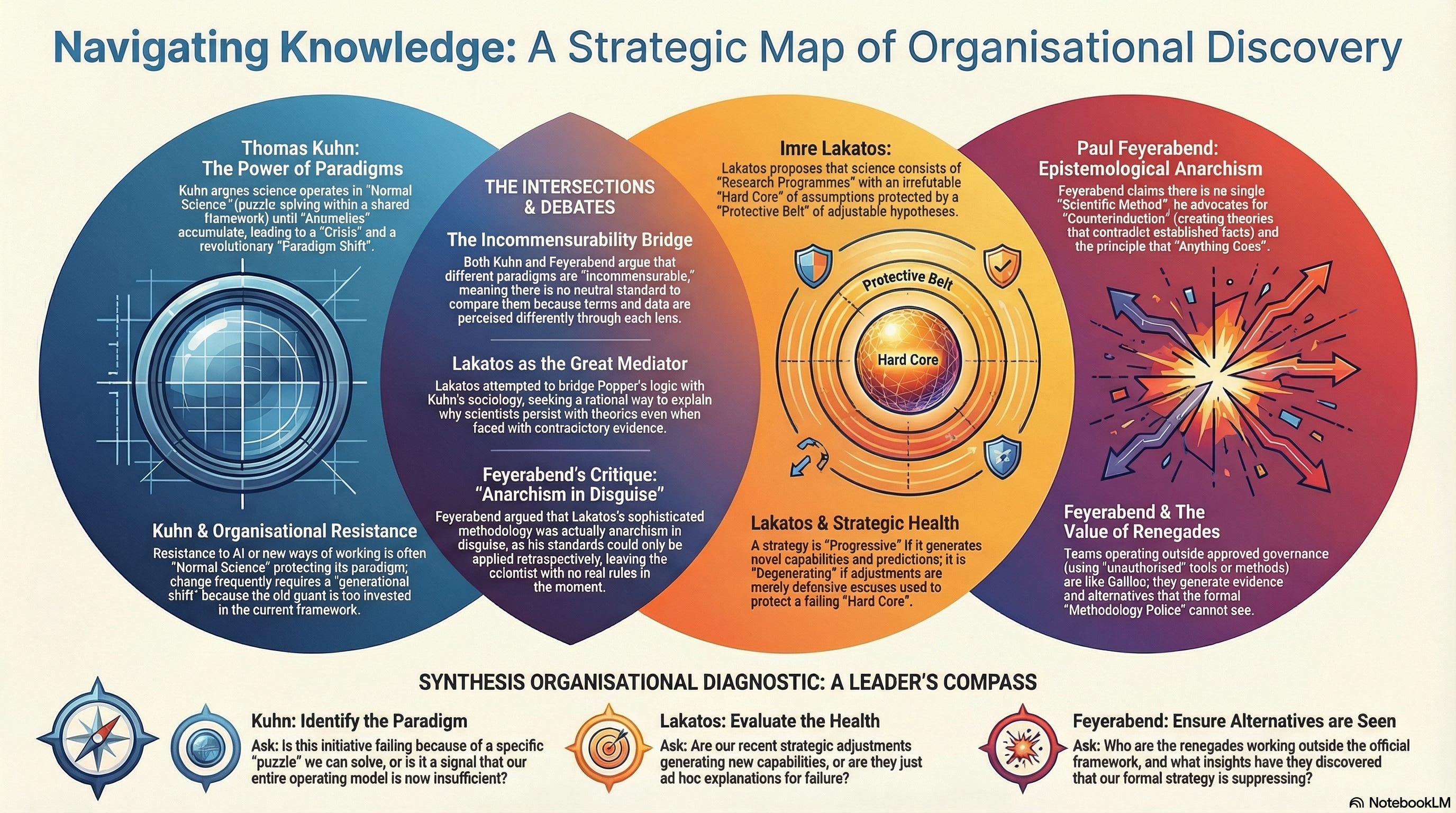 Why Kuhn, Lakatos, and Feyerabend Explain How Organisations Actually Adopt What They Have Learnt.