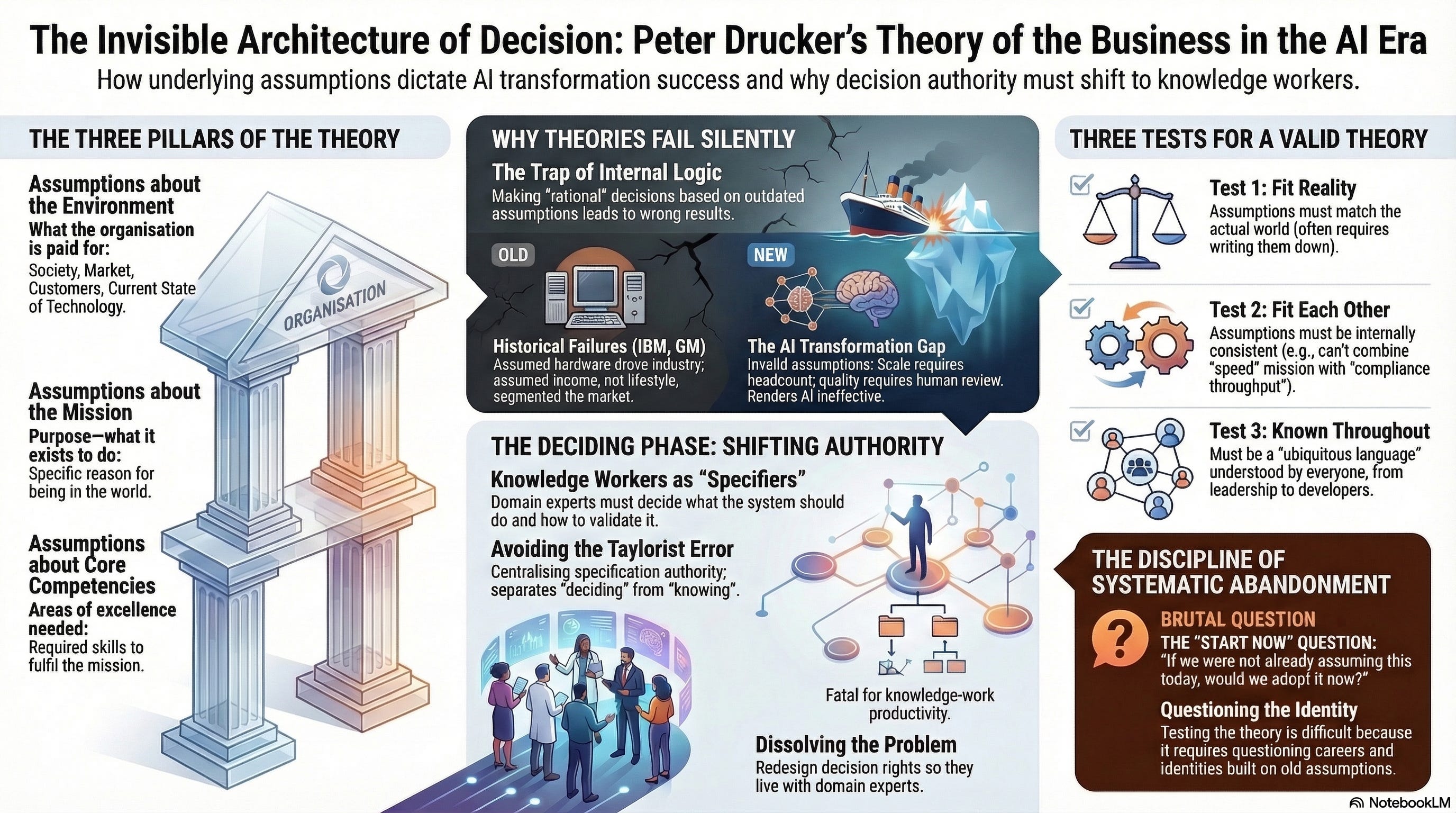 The AI transformation context reproduces this pattern exactly. Most large enterprises operate on a theory of the business that was formed before AI changed what is possible. The assumptions run deep: that competitive advantage comes from proprietary processes, that knowledge resides in individuals, that specification is a planning activity, that quality requires human review, that scale requires headcount. Each of these assumptions was valid. Several are becoming invalid. The organisation that continues to decide on the basis of yesterday’s theory will make decisions that are perfectly logical and completely wrong.