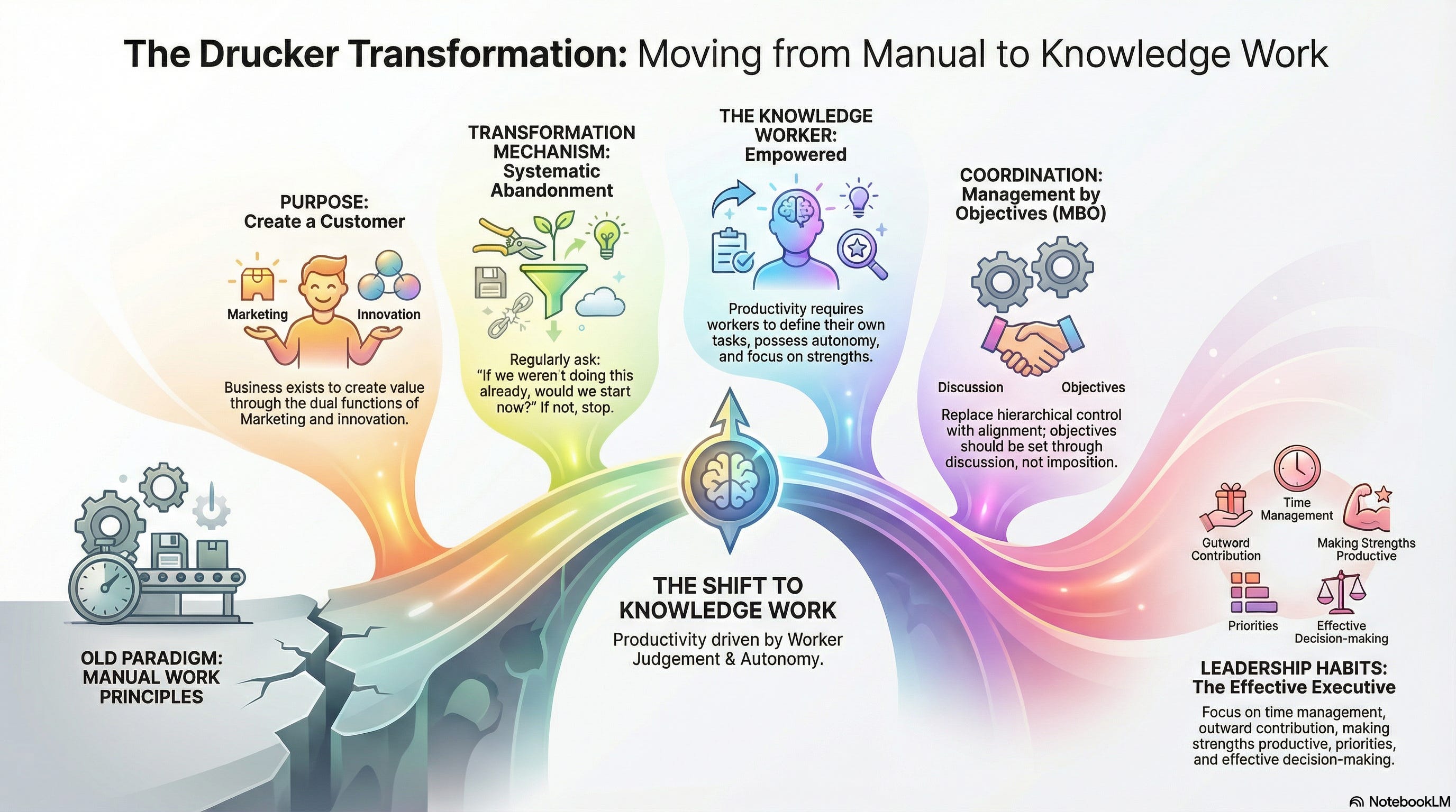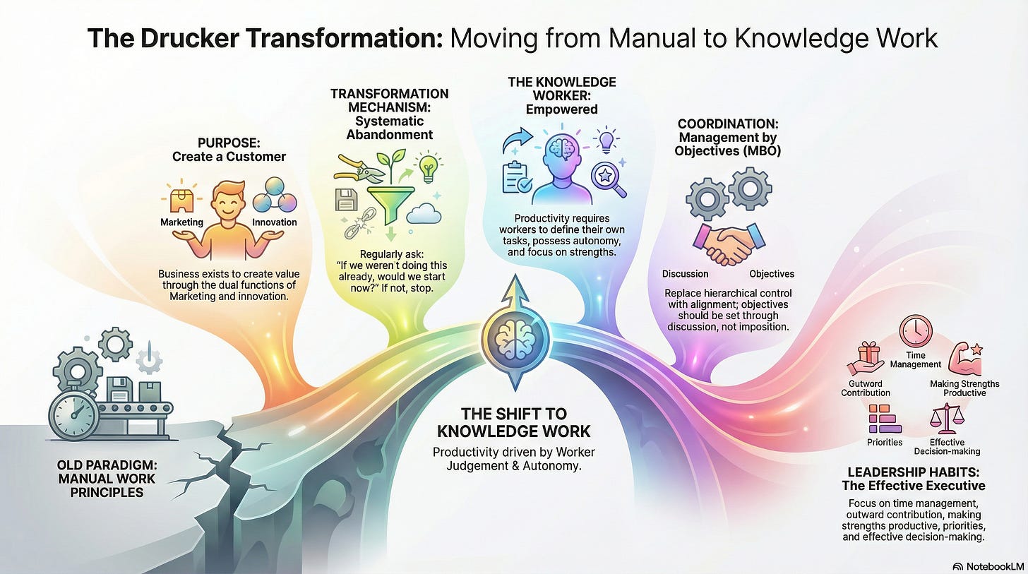 Drucker’s knowledge worker concept is the foundation stone. A knowledge worker owns their means of production: their knowledge. Unlike a manual worker, the knowledge worker must define the task before they can do it. Their output is quality, not quantity. They cannot be supervised in the Taylorist sense because the work is invisible until it produces results. Autonomy is not a perk. It is a structural requirement.