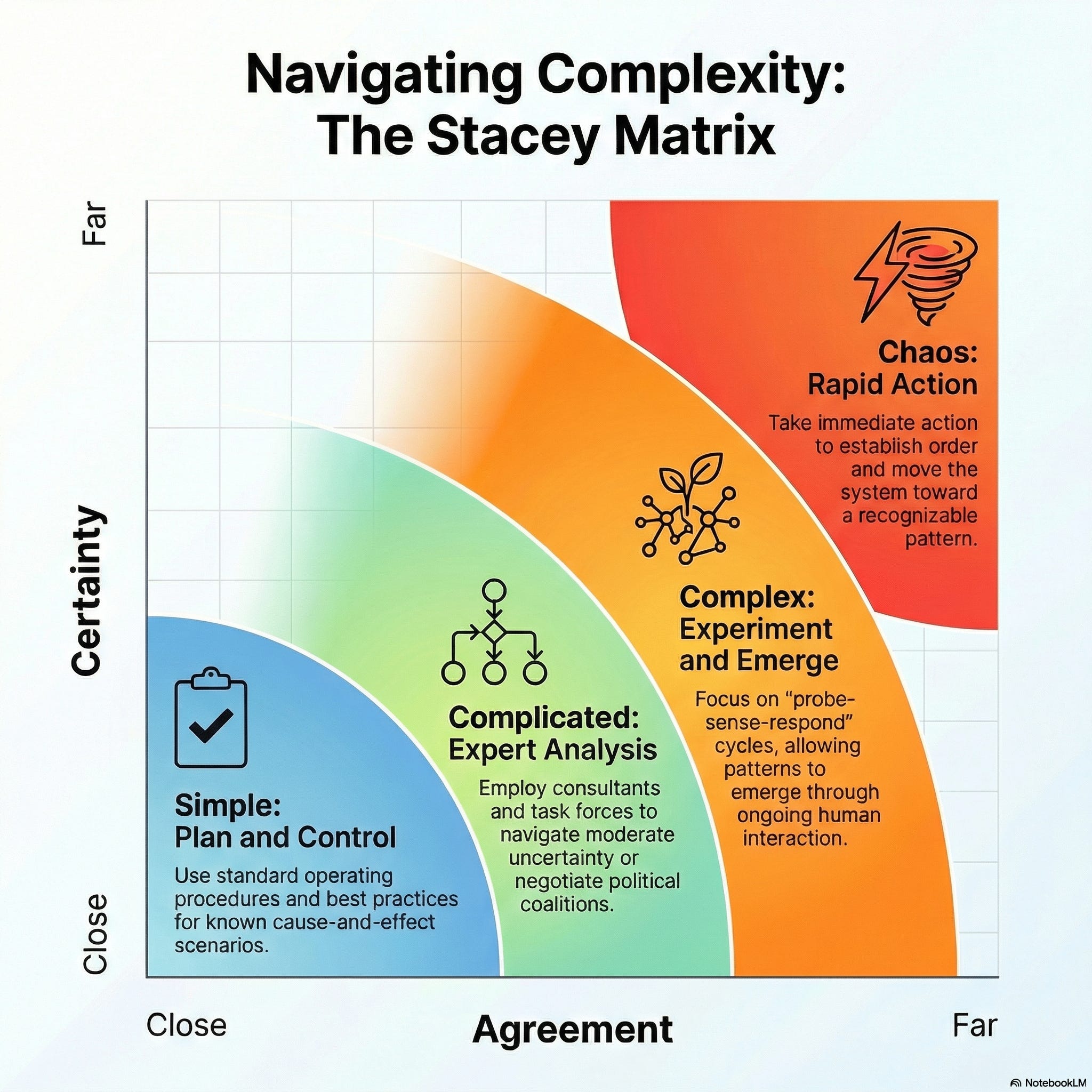 Your forty-seven-page AI transformation roadmap is not a strategy. It is an intended strategy, a gesture, that will provoke responses from every part of the organisation. Some of those responses will be supportive. Many will be defensive. Some will be creative adaptations that no one anticipated. The teams quietly using Claude to solve real problems outside the accepted process are not (necessarily) non-compliant; they are the emergent strategy trying to tell you where the value is. Stacey would say, “pay attention to those responses.”