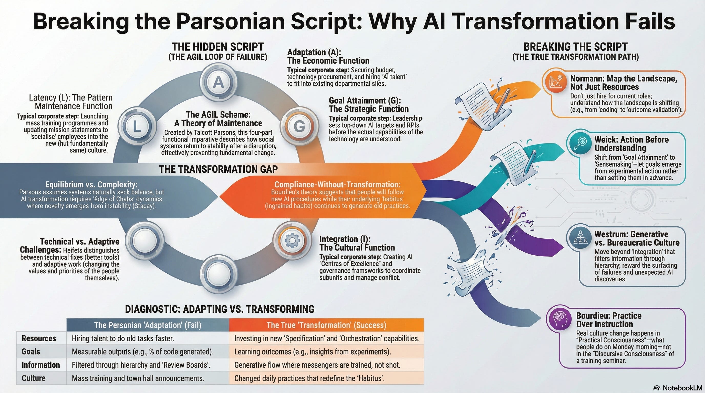This pattern is so universal that it cannot be explained by individual failure. It is structural. And it was codified by the most influential sociologist of the twentieth century: Talcott Parsons. When your AI adoption programme secures resources, sets strategic goals, coordinates teams, and retrains staff, it is executing a Parsonian script. And the script is designed, at every level, to restore equilibrium rather than to produce change. Parsons’ framework was criticised as conservative, teleological, and incapable of accounting for power, conflict, or agency. This article focuses not on whether it is right but on why it matters: it is the invisible operating system of enterprise change management, and understanding it is the first step toward interrupting it.