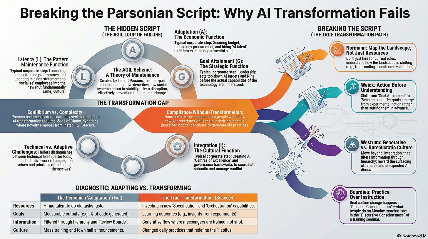 Parsons is valuable not because he is right but because he is diagnostic. When you recognise AGIL logic operating in your transformation programme, you have identified the mechanism that will convert your transformation into adaptation. The intervention is not to abandon the functions; the organisation does need resources, direction, coordination, and culture. The intervention is to interrupt the equilibrium-seeking at each stage.