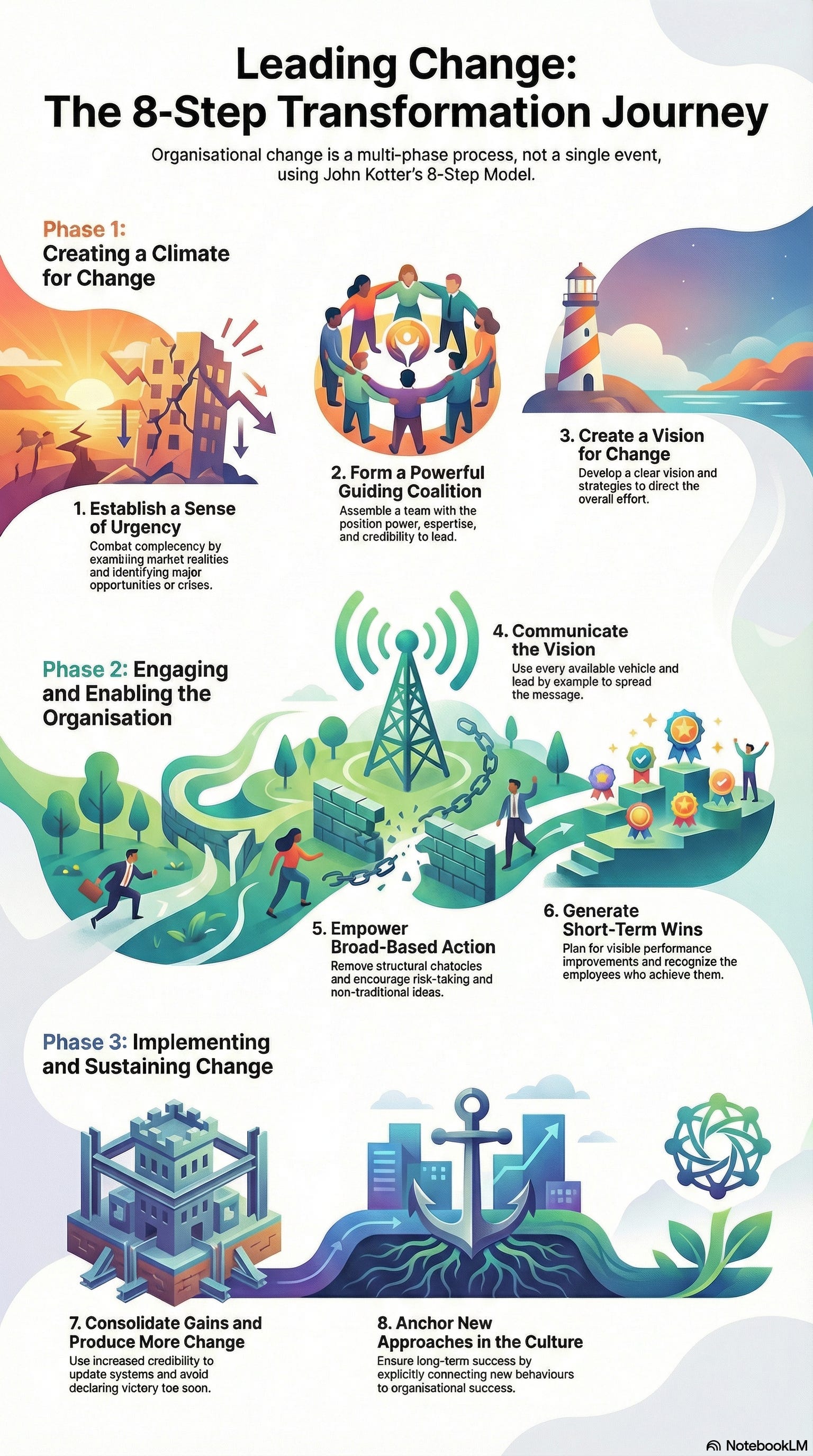 Kotter’s framework deserves a fair hearing, not least because it crystallised real observations about why transformation fails. His argument organises change into three phases.