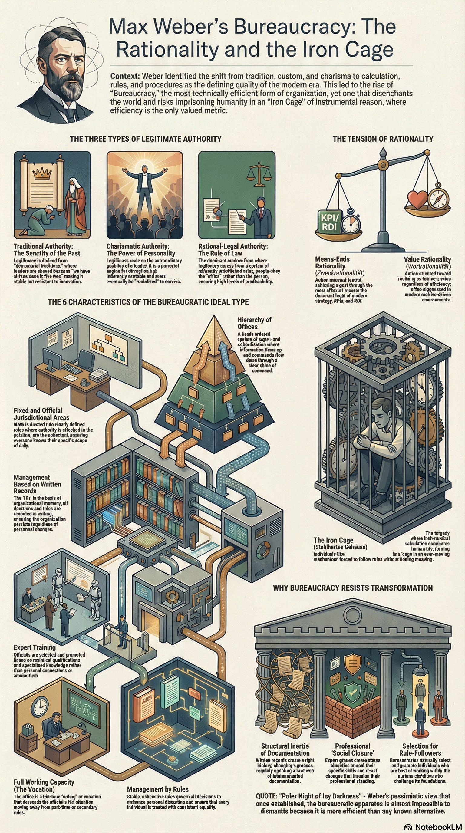 Weber described bureaucracy not as a pejorative but as the most technically efficient form of organisation ever devised: precision, speed, continuity, strict subordination, reduction of friction. He summarised it as a machine. These are exactly the qualities that resist transformation, because transformation requires their opposites: imprecision (experimentation), slowness (learning), ambiguity (exploration), and discontinuity (abandoning what no longer works). The bureaucratic machine is not broken. It is doing precisely what it was designed to do. And that is the problem.