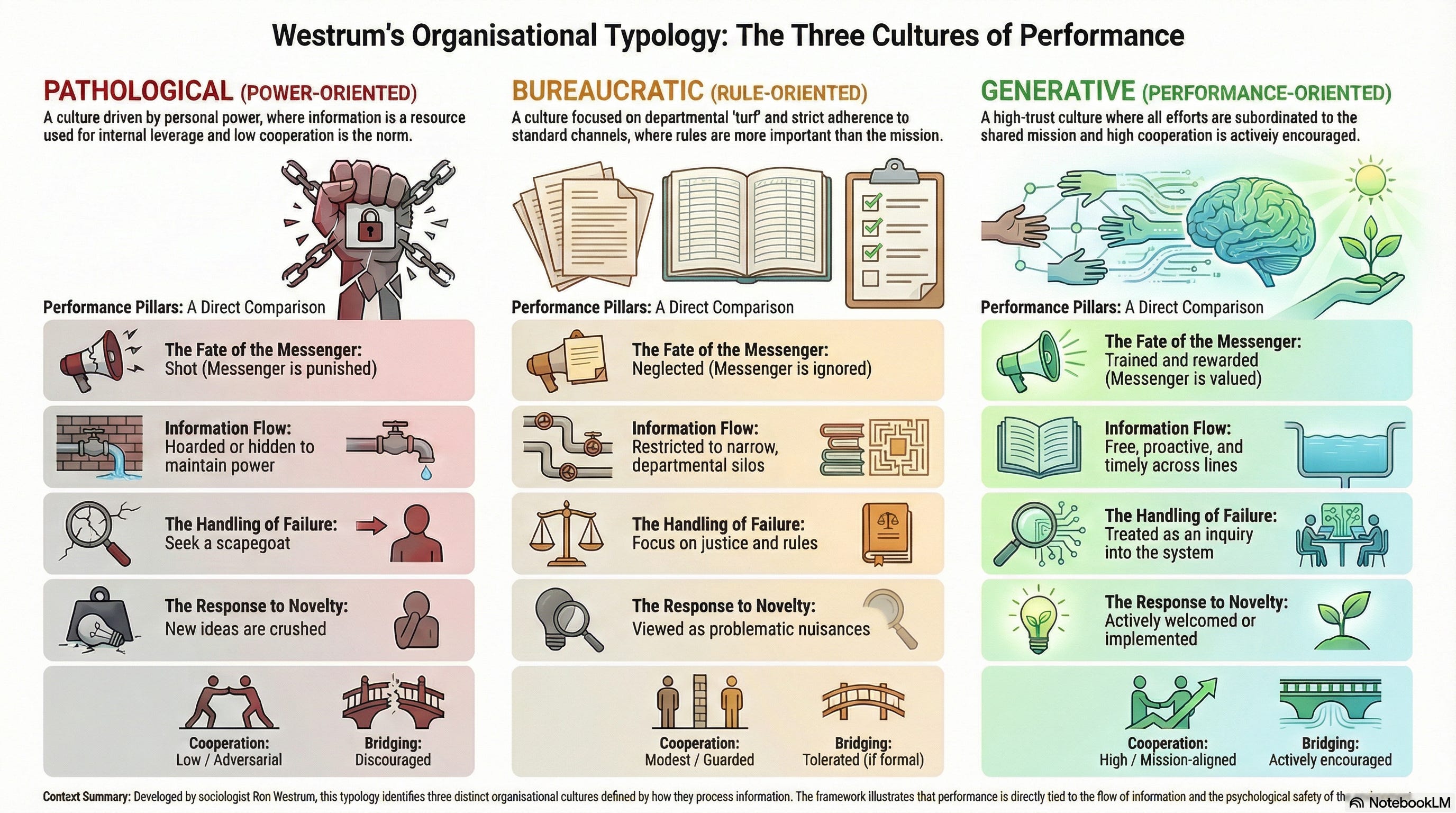 In pathological cultures, information is a weapon. The leader’s preoccupation is personal power and status; this preoccupation is absorbed by the workforce, who operate with it in mind. Messengers of bad news are punished or marginalised. Failure is concealed. Responsibilities are shirked. New ideas are crushed. Bridging between departments is discouraged because information is a positional good; sharing it makes you less powerful.