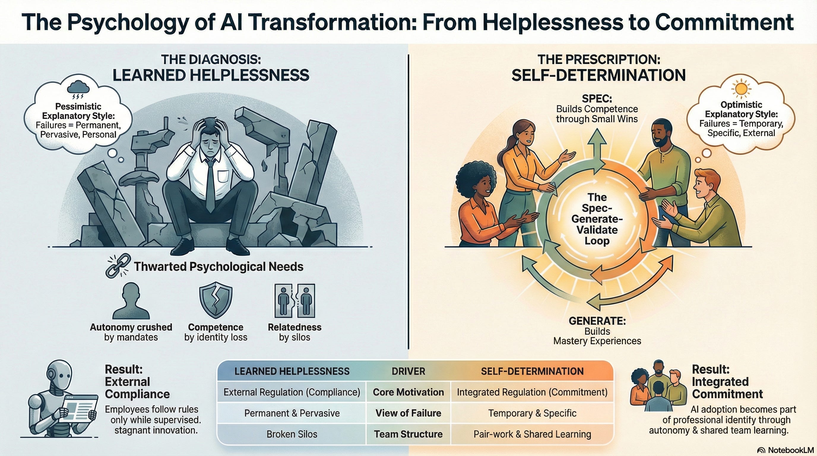 The synthesis with Seligman is this: learned helplessness is what happens when all three needs are thwarted simultaneously over time. When your actions have no effect (autonomy destroyed), when your existing skills become irrelevant and no support is provided for new ones (competence threatened), and when the team structures you relied on are disrupted without replacement (relatedness severed) the rational response is disengagement. Seligman describes the outcome. Deci and Ryan describe the mechanism.