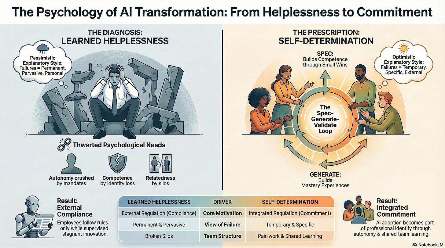 The diagnostic: in any organisation with a history of failed transformation programmes, you are dealing with a population whose learned helplessness is rational, whose psychological needs are being systematically thwarted, and whose apparent “resistance” is actually the most adaptive response available to them given the conditions they face.