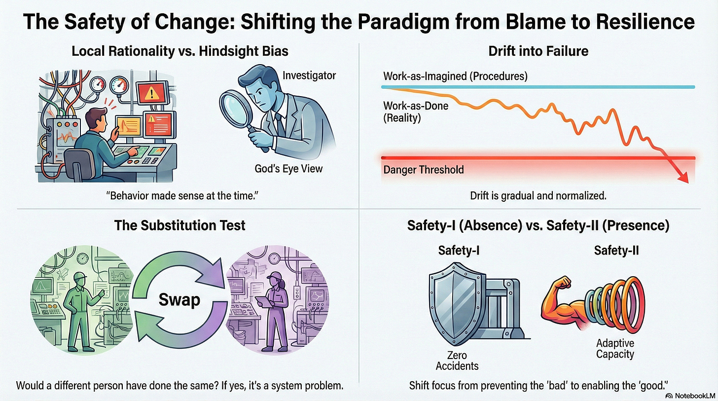 Dekker’s most practically useful tool is the substitution test. When something goes wrong, ask: if you replaced this person or team with another similarly trained group in the exact same situation, would they likely have done the same thing? If yes, you have a systemic issue, not a people problem.