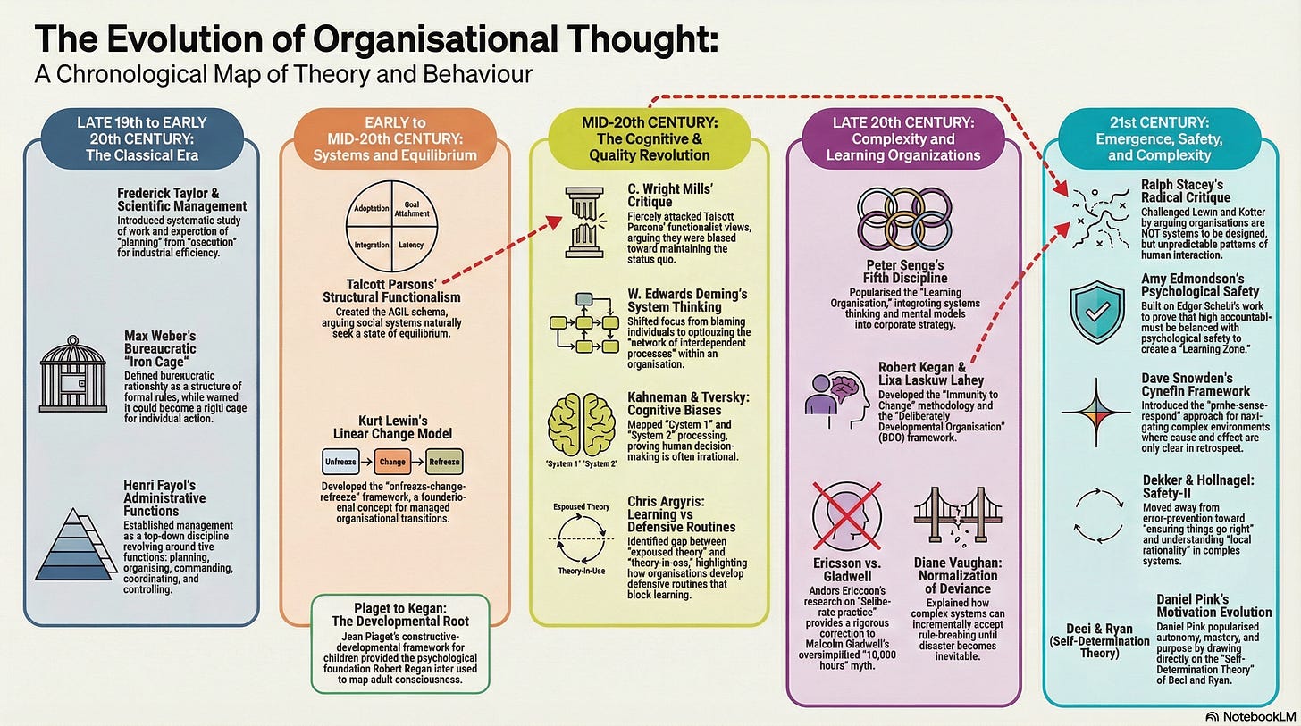 Frederick Winslow Taylor (1856–1915) Key insight: Work can be scientifically analysed, decomposed into elementary tasks, and optimised through standardised methods and measured output. Extends: nothing prior; Taylor invented industrial management. Criticised by: Deming (rejected Taylorism as root cause of industrial dysfunction); Argyris (shows why separating thinking from doing creates defensive routines); Giddens (Taylorist structures reproduce themselves through daily interaction); Stacey (Taylorism offers false certainty in uncertain conditions); Marquet and McChrystal (explicitly framed their work as overcoming the Taylorist separation of planning from execution).