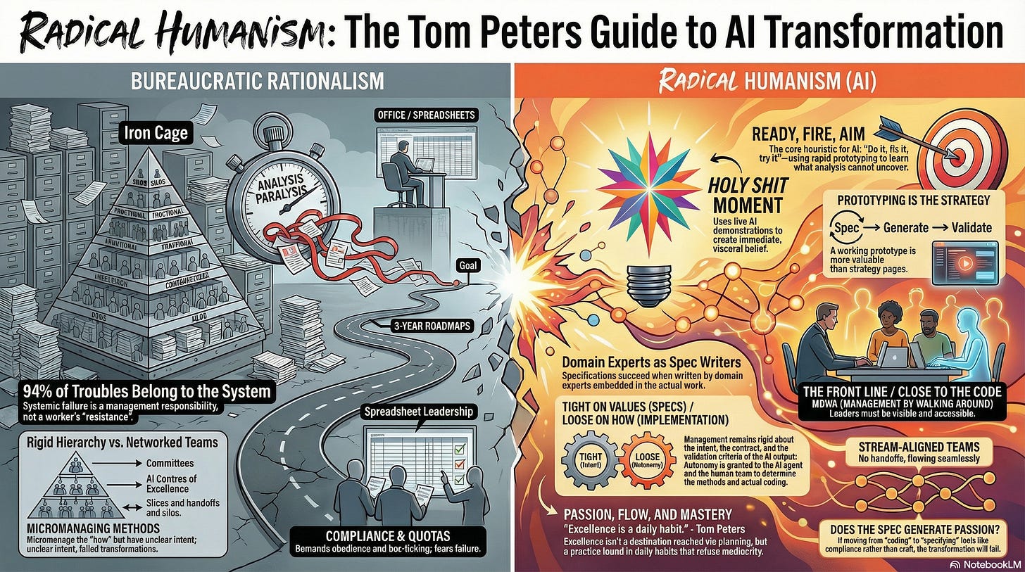 The synthesis this series points toward is what might be called disciplined liberation: Peters’s energy combined with Drucker’s discipline, Weick’s sensemaking rigour combined with the emotional commitment that makes people care enough to do the sensemaking well, the structural awareness of why organisations resist change (Giddens, Bourdieu, Argyris) combined with the refusal to accept that resistance as the final word. Normann’s conceptual elegance combined with Peters’s insistence that elegance without action is decoration. The discipline of the specification combined with the liberation of the people who write it.